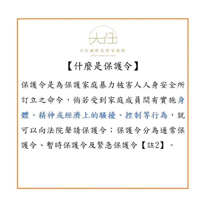 保護令是為保護家庭暴力被害人人身安全所訂立之命令,倘若受到家庭成員間有實施身體、精神或經濟上的騷擾、控制等行為,就可以向法院聲請保護令;保護令分為通常保護令、暫時保護令及緊急保護令【註2】。