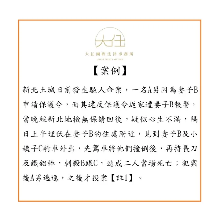 【註1】李湘文,土城家暴男「不甩保護令」砍死妻子、小姨子!律師嘆:1張紙對瘋子真的沒用,yahoo新聞,https://tw.news.yahoo.com/%E5%9C%9F%E5%9F%8E%E5%AE%B6%E6%9A%B4%E7%94%B7-%E4%B8%8D%E7%94%A9%E4%BF%9D%E8%AD%B7%E4%BB%A4-%E7%A0%8D%E6%AD%BB%E5%A6%BB%E5%AD%90-%E5%B0%8F%E5%A7%A8%E5%AD%90-%E5%BE%8B%E5%B8%AB%E5%98%86-090023751.html。(最後瀏覽日期:114年7月10日)