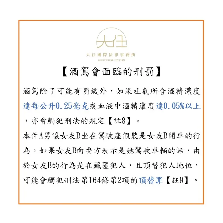 另外本件A男讓女友B坐在駕駛座假裝是女友B開車的行為,如果女友B向警方表示是她駕駛車輛的話,由於女友B的行為是在藏匿犯人,且頂替犯人地位,則可能會觸犯刑法第164條第2項的頂替罪【註9】。