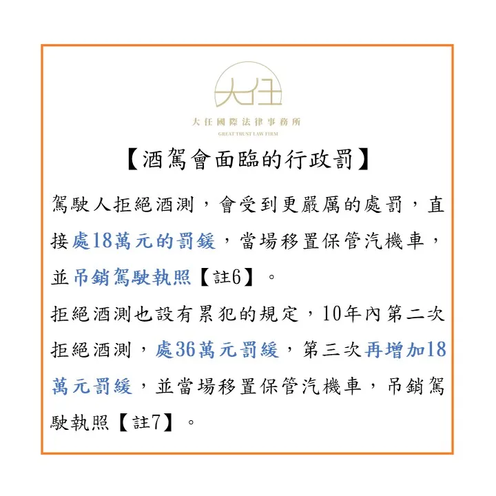 【註6】道路交通管理處罰條例第35條第4項第2款:「汽機車駕駛人有下列各款情形之一者,處新臺幣十八萬元罰鍰,並當場移置保管該汽機車、吊銷其駕駛執照;如肇事致人重傷或死亡者,吊銷其駕駛執照,並不得再考領:二、拒絕接受第一項測試之檢定。」