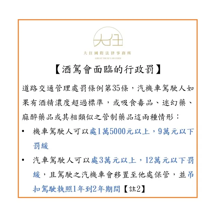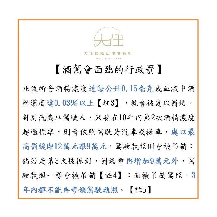 酒駕相關行政罰,規定在道路交通管理處罰條例(下稱道交條例)第35條,汽機車駕駛人如果有酒精濃度超過標準,或吸食毒品、迷幻藥、麻醉藥品或其相類似之管制藥品這兩種情形,就違反道交條例的規定,機車駕駛人可以處1萬5000元以上,9萬元以下罰緩;汽車駕駛人可以處3萬元以上,12萬元以下罰緩,且駕駛之汽機車會移置至他處保管,並吊扣駕駛執照1年到2年期間【註2】。而酒精濃度超過多少才會被處罰?若吐氣所含酒精濃度達每公升0.15毫克或血液中酒精濃度達0.03%以上【註3】,就會被處以上面的罰緩。