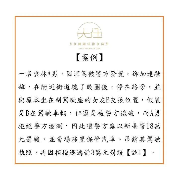 一名來自雲林A男,因酒駕被警方發覺,卻加速駛離,在附近街道繞了幾圈後,停在路旁,並與原本坐在副駕駛座的女友B交換位置,假裝是B在駕駛車輛,但還是被警方識破,而A男拒絕警方酒測,因此遭警方處以新臺幣18萬元罰緩,並當場移置保管汽車、吊銷其駕駛執照,再因拒檢逃逸罰3萬元罰緩【註1】。