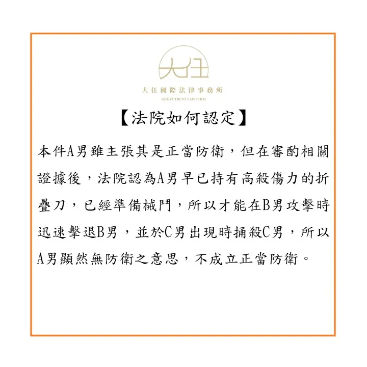 本件A男雖主張其是正當防衛,但在審酌相關證據後,法院認為A男早已持有高殺傷力的折疊刀,已經準備械鬥,所以才能在B男攻擊時迅速擊退B男,並於C男出現時捅殺C男,所以A男顯然無防衛之意思,不成立正當防衛。