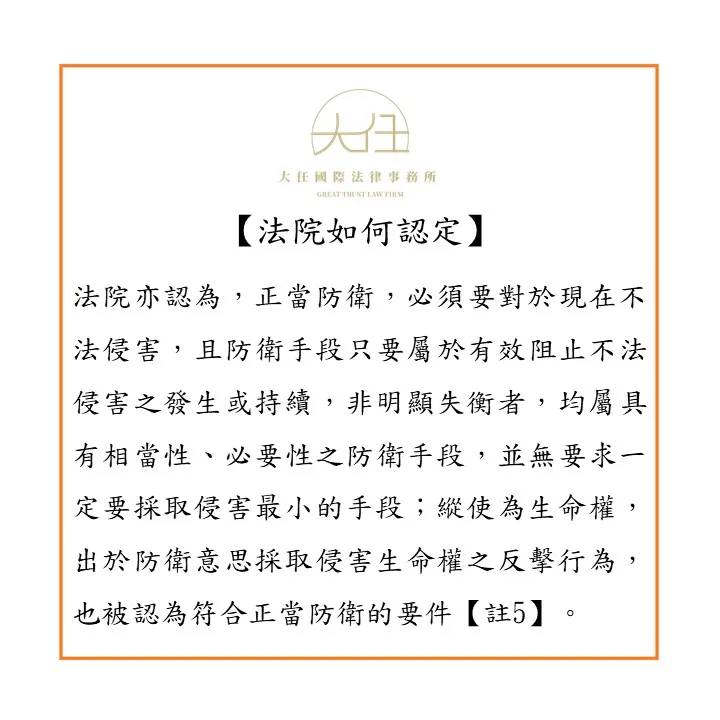 法院亦認為,正當防衛,必須要對於現在不法侵害,且防衛手段只要屬於有效阻止不法侵害之發生或持續,非明顯失衡者,均屬具有相當性、必要性之防衛手段,並無要求一定要採取侵害最小的手段;縱使為生命權,出於防衛意思採取侵害生命權之反擊行為,也被認為符合正當防衛的要件【註5】。