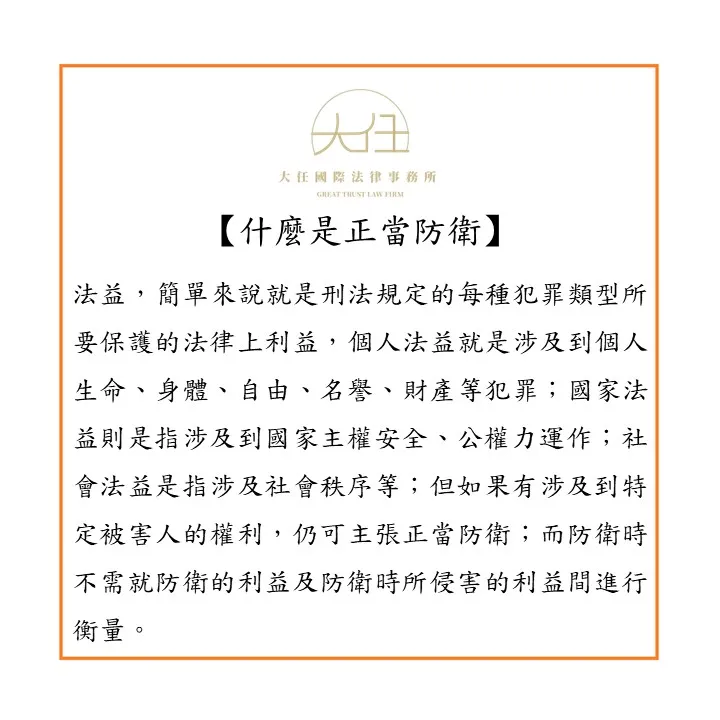 另外須為自己或他人的個人法益遭受侵害時,才能進行防衛行為,如果是國家法益或社會法益,則非一般民眾可以主張防衛之標的;法益,簡單來說就是刑法規定的每種犯罪類型所要保護的法律上利益,個人法益就是涉及到個人生命、身體、自由、名譽、財產等犯罪,如殺人、妨害名譽、竊盜;國家法益則是指涉及到國家主權安全、公權力運作,如內亂、外患、瀆職;社會法益是指涉及社會秩序等,如醉態駕駛罪、偽造文書等;但如果有涉及到特定被害人的權利,如放火罪,仍可主張正當防衛;而防衛時不需就防衛的利益及防衛時所侵害的利益間進行衡量。