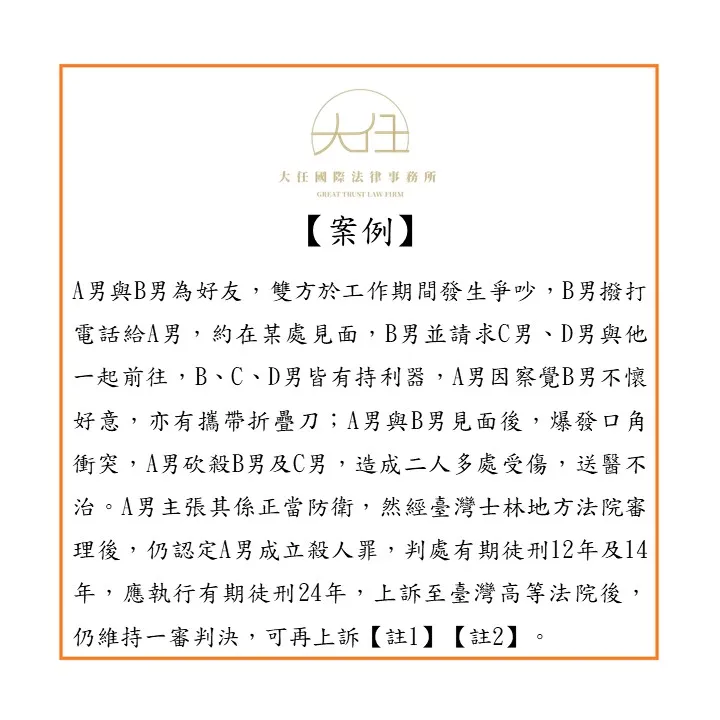 A男與B男為好友,且一同擔任清潔隊員工,雙方於工作期間發生爭吵,B男於112年11月16日凌晨撥打電話給A男,約在某處見面,B男並請求C男、D男與他一起前往,B、C、D男皆有持利器,A男因察覺B男不懷好意,亦有攜帶折疊刀;A男與B男見面後,爆發口角衝突,A男砍殺B男及C男,造成二人多處受傷,送醫不治。A男主張其係正當防衛,然經臺灣士林地方法院審理後,仍認定A男成立殺人罪,判處有期徒刑12年及14年,應執行有期徒刑24年,上訴至臺灣高等法院後,仍維持一審判決,可再上訴【註1】【註2】。