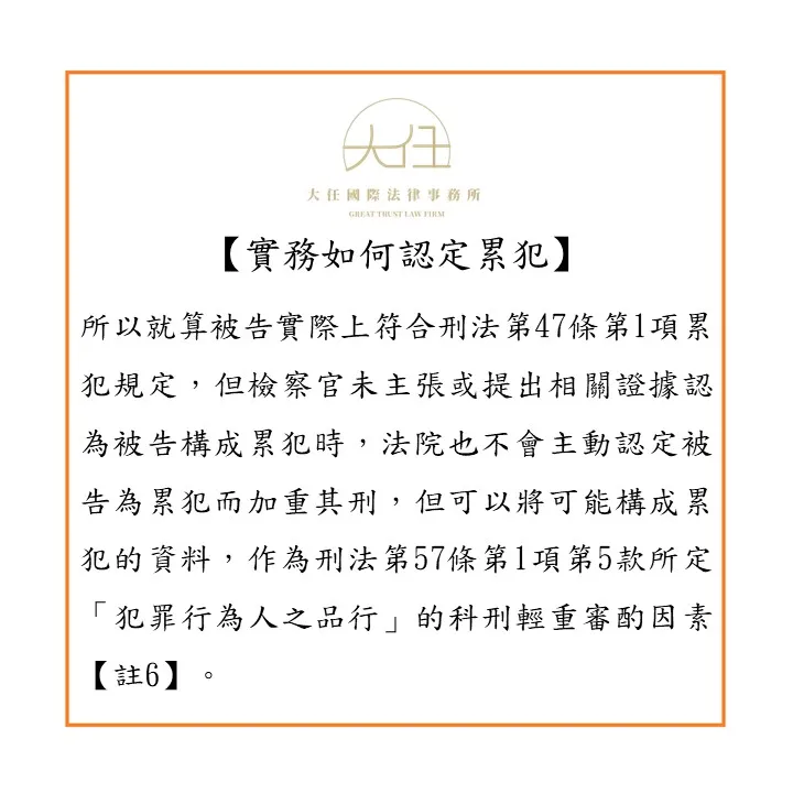 所以就算被告實際上符合刑法第47條第1項累犯規定,但檢察官未主張或提出相關證據認為被告構成累犯時,法院也不會主動認定被告為累犯而加重其刑,但可以將可能構成累犯的資料,作為刑法第57條第1項第5款所定「犯罪行為人之品行」的科刑輕重審酌因素【註6】。