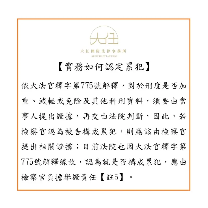 依大法官釋字第775號解釋,對於刑度是否加重、減輕或免除及其他科刑資料,須要由當事人提出證據,再交由法院判斷,因此,若檢察官認為被告構成累犯,則應該由檢察官提出相關證據;目前法院也因大法官釋字第775號解釋緣故,認為就是否構成累犯,應由檢察官負擔舉證責任【註5】。