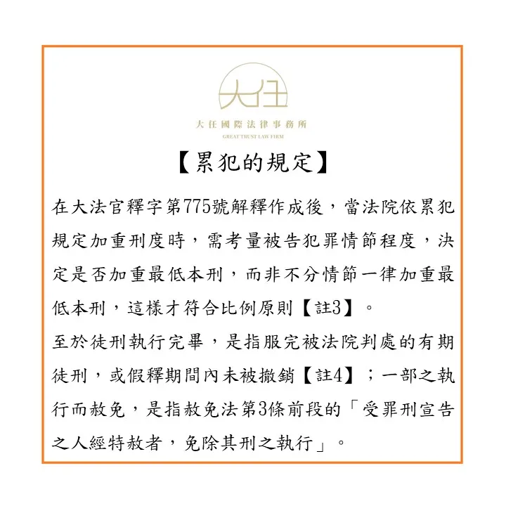另外在大法官釋字第775號解釋作成後,當法院依累犯規定加重刑度時,需考量被告犯罪情節程度,決定是否加重最低本刑,而非不分情節一律加重最低本刑,這樣才符合比例原則【註3】。