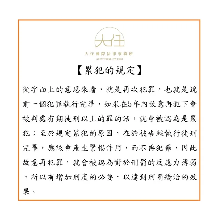 累犯,從字面上的意思來看,就是再次犯罪,我國刑法針對累犯的規定為:「受徒刑之執行完畢,或一部之執行而赦免後,五年以內故意再犯有期徒刑以上之罪者,為累犯,加重本刑至二分之一。」【註2】,也就是說前一個犯罪執行完畢,如果在5年內故意再犯下會被判處有期徒刑以上的罪的話,就會被認為是累犯;至於規定累犯的原因,在於被告經執行徒刑完畢,應該會產生緊惕作用,而不再犯罪,因此故意再犯罪,就會被認為對於刑罰的反應力薄弱,所以有增加刑度的必要,以達到刑罰矯治的效果。