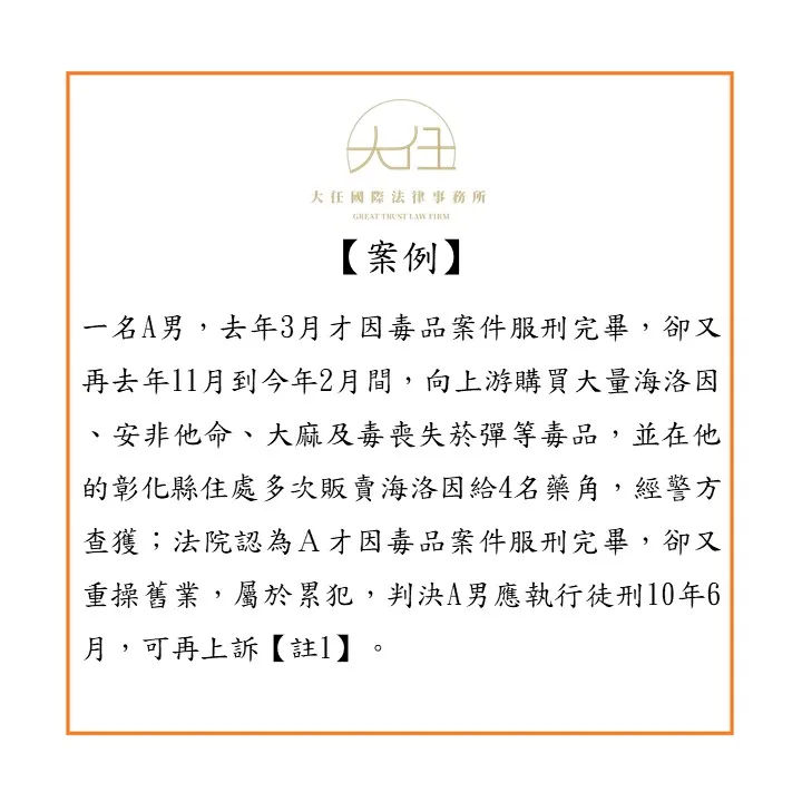 一名A男,去年3月才因毒品案件服刑完畢,卻又再去年11月到今年2月間,向上游購買大量海洛因、安非他命、大麻及毒喪失菸彈等毒品,並在他的彰化縣住處多次販賣海洛因給4名藥角,經警方查獲;法院認為A才因毒品案件服刑完畢,卻又重操舊業,屬於累犯,判決A男應執行徒刑10年6月,可再上訴【註1】。