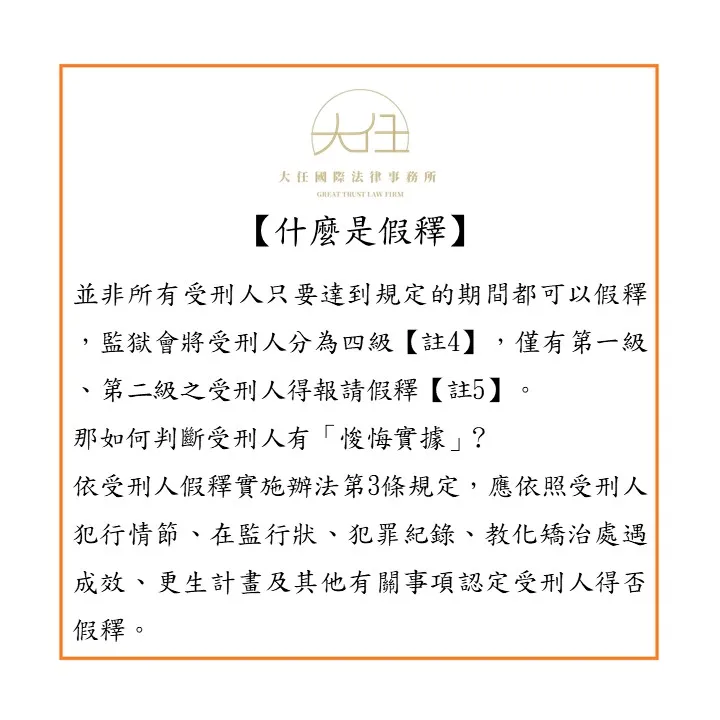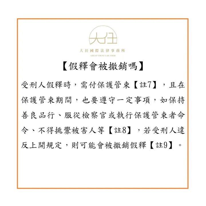 另外,受刑人假釋時,需付保護管束【註7】,且在保護管束期間,也要遵守一定事項,如保持善良品行、服從檢察官或執行保護管束者命令、不得挑釁被害人等【註8】,若受刑人違反上開規定,則可能會被撤銷假釋【註9】。