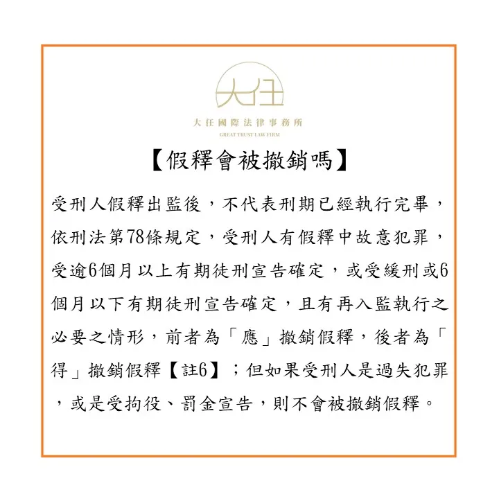 受刑人假釋出監後,不代表刑期已經執行完畢,依刑法第78條規定,受刑人有假釋中故意犯罪,受逾6個月以上有期徒刑宣告確定,或受緩刑或6個月以下有期徒刑宣告確定,且有再入監執行之必要之情形,前者為「應」撤銷假釋,後者為「得」撤銷假釋【註6】;但如果受刑人是過失犯罪,或是受拘役、罰金宣告,則不會被撤銷假釋。