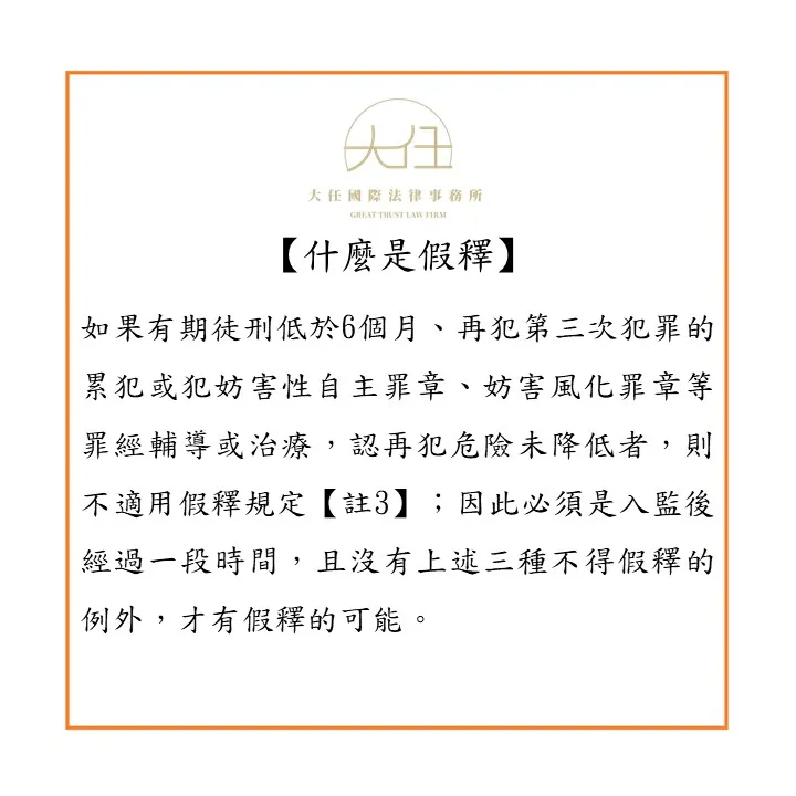 我國刑法第77條第1項規定:「受徒刑之執行而有悛悔實據者,無期徒刑逾二十五年,有期徒刑逾二分之一、累犯逾三分之二,由監獄報請法務部,得許假釋出獄。」;但如果有期徒刑低於6個月、再犯第三次犯罪的累犯或犯妨害性自主罪章、妨害風化罪章等罪經輔導或治療,認再犯危險未降低者,則不適用假釋規定【註3】;因此必須是入監後經過一段時間,且沒有上述三種不得假釋的例外,才有假釋的可能。