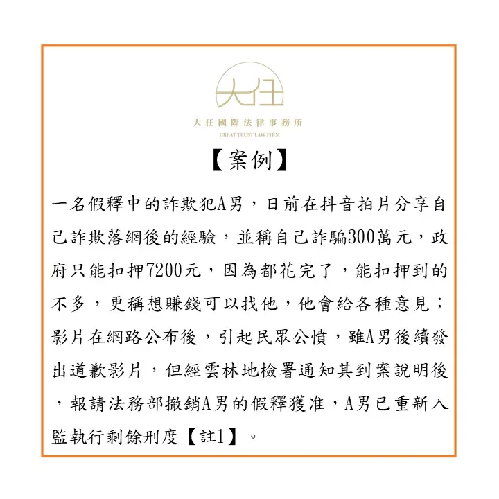 一名假釋中的詐欺犯A男,日前在抖音拍片分享自己詐欺落網後的經驗,並稱自己詐騙300萬元,政府只能扣押7200元,因為都花完了,能扣押到的不多,更稱想賺錢可以找他,他會給各種意見;影片在網路公布後,引起民眾公憤,雖A男後續發出道歉影片,但經雲林地檢署通知其到案說明後,報請法務部撤銷A男的假釋獲准,A男已重新入監執行剩餘刑度【註1】。