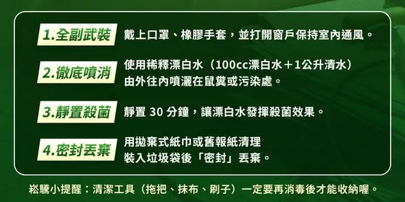崧驣病媒防治企業社提醒您,居家大掃除時,看見家中角落發現老鼠蹤跡或排泄物,千萬別直接掃,務必戴口罩、戴乳膠手套做好自身安全防護,安全清理。