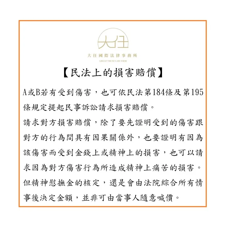 除了上開可能會觸犯的刑法規定外,A或B若有受到傷害,也可依民法第184條及第195條規定提起民事訴訟請求損害賠償。