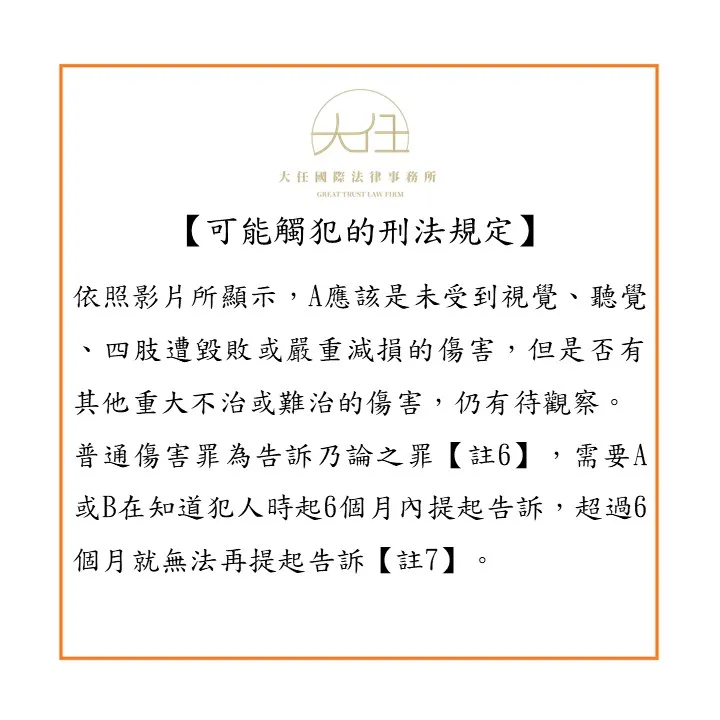 要注意的是,普通傷害罪為告訴乃論之罪【註6】,需要A或B在知道犯人時起6個月內提起告訴,超過6個月就無法再提起告訴【註7】。