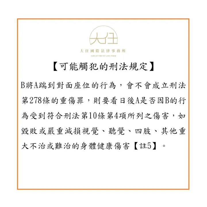至於B將A踹到對面座位的行為,會不會成立刑法第278條的重傷罪,則要看日後A是否因B的行為受到符合刑法第10條第4項所列之傷害,如毀敗或嚴重減損視覺、聽覺、四肢、其他重大不治或難治的身體健康傷害【註5】;依照影片所顯示,A應該是未受到視覺、聽覺、四肢遭毀敗或嚴重減損的傷害,但是否有其他重大不治或難治的傷害,仍有待觀察。