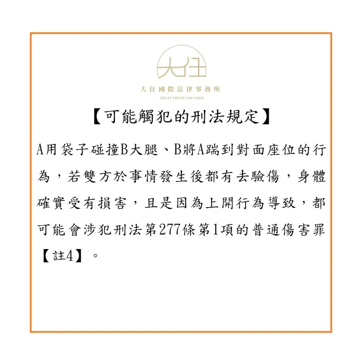 A用袋子碰撞B大腿、B將A踹到對面座位的行為,若雙方於事情發生後都有去驗傷,身體確實受有損害,且是因為上開行為導致,都可能會涉犯刑法第277條第1項的普通傷害罪【註4】。