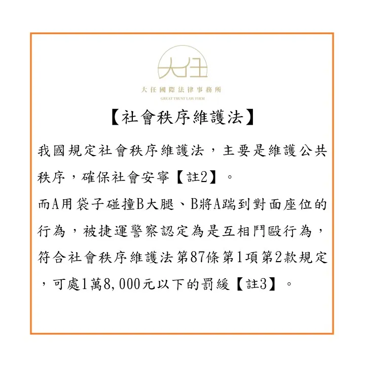 而A用袋子碰撞B大腿、B將A踹到對面座位的行為,被捷運警察認定為是互相鬥毆行為,符合社會秩序維護法第87條第1項第2款規定,可處1萬8,000元以下的罰緩【註3】。