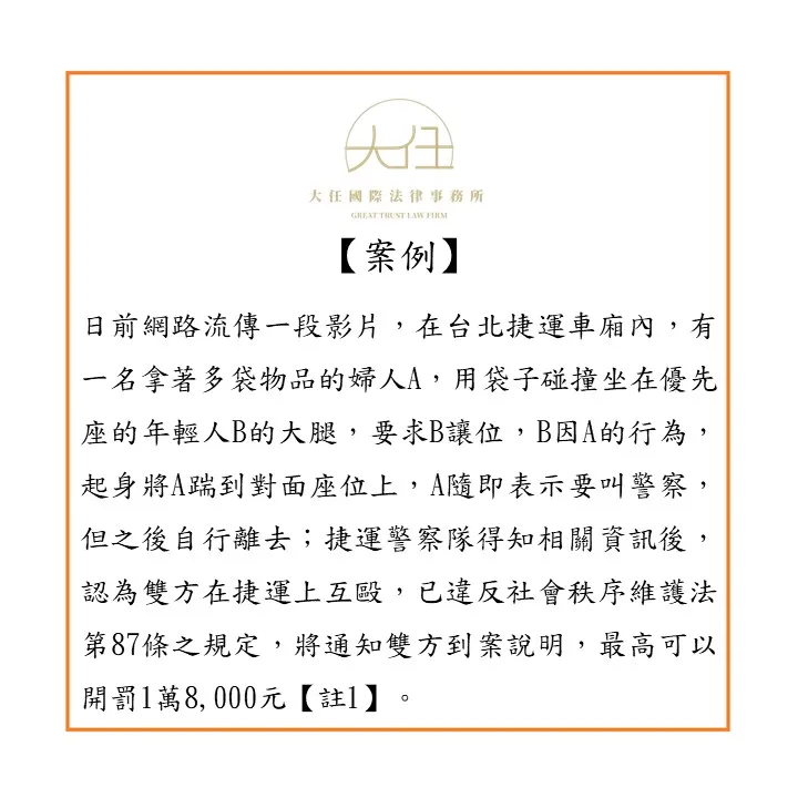 日前網路流傳一段影片,在台北捷運車廂內,有一名拿著多袋物品的婦人A,用袋子碰撞坐在優先座的年輕人B的大腿,要求B讓位,B因A的行為,起身將A踹到對面座位上,A隨即表示要叫警察,但之後自行離去;捷運警察隊得知相關資訊後,認為雙方在捷運上互毆,已違反社會秩序維護法第87條之規定,將通知雙方到案說明,最高可以開罰1萬8,000元【註1】。