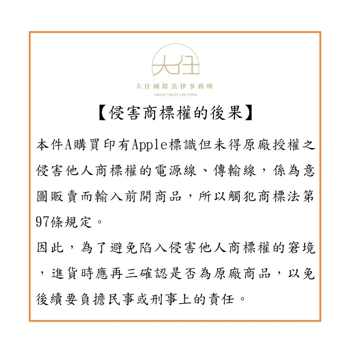 本件A購買印有Apple標識但未得原廠授權之侵害他人商標權的電源線、傳輸線,係為 意圖販賣而輸入前開商品,所以觸犯商標法第97條規定。因此,為了避免陷入侵害他人商標權的窘境,進貨時應再三確認是否為原廠商品,以免後續要負擔民事或刑事上的責任。