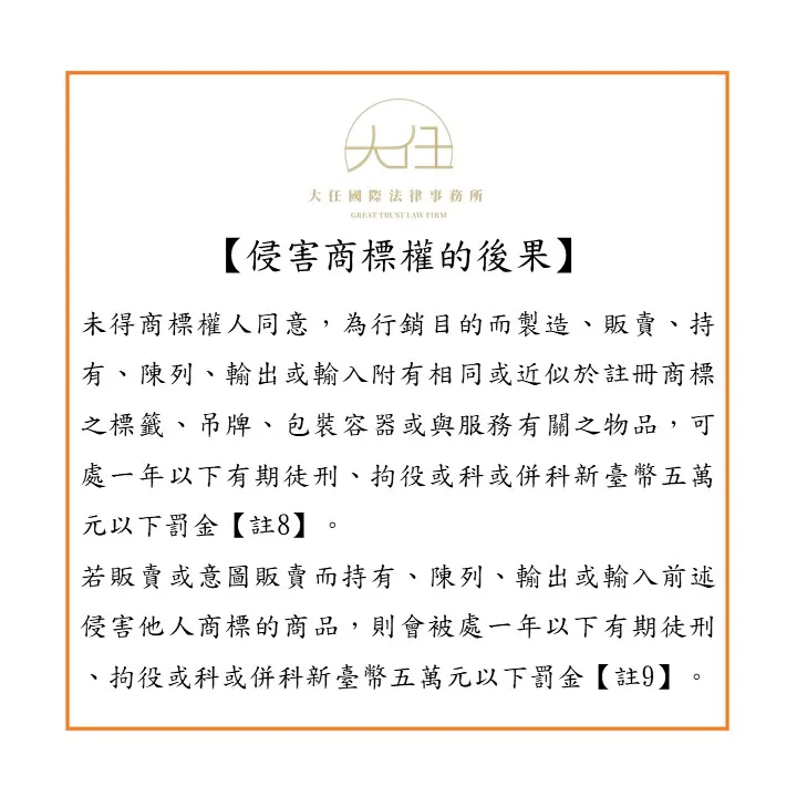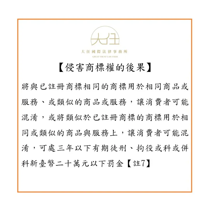另外將與已註冊商標相同的商標用於相同商品或服務、或類似的商品或服務,讓消費者可能混淆,或將類似於已註冊商標的商標用於相同或類似的商品與服務上,讓消費者可能混淆,可處三年以下有期徒刑、拘役或科或併科新臺幣二十萬元以下罰金【註7】