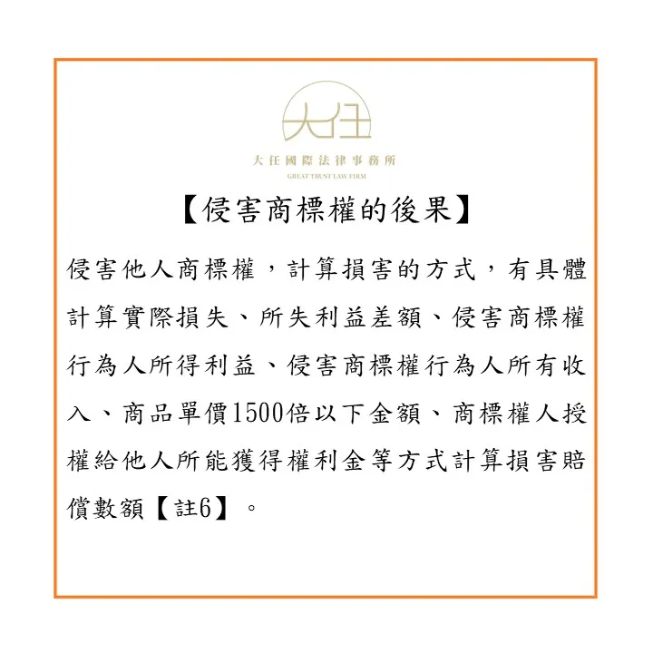 而侵害他人商標權,計算損害的方式,有具體計算實際損失、所失利益差額、侵害商標權行為人所得利益、侵害商標權行為人所有收入、商品單價1500倍以下金額、商標權人授權給他人所能獲得權利金等方式計算損害賠償數額【註6】。