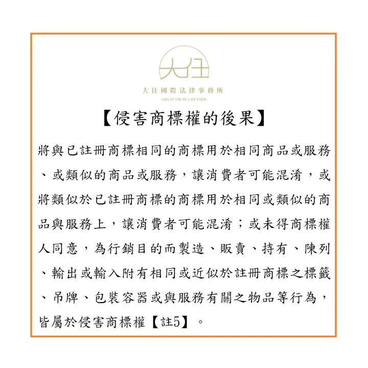 將與已註冊商標相同的商標用於相同商品或服務、或類似的商品或服務,讓消費者可能混淆,或將類似於已註冊商標的商標用於相同或類似的商品與服務上,讓消費者可能混淆;或未得商標權人同意,為行銷目的而製造、販賣、持有、陳列、輸出或輸入附有相同或近似於註冊商標之標籤、吊牌、包裝容器或與服務有關之物品等行為,皆屬於侵害商標權【註5】。
