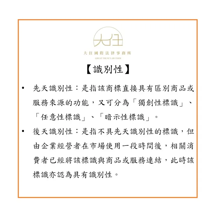 商標必須具有識別性,所謂的識別性,是指一般消費者可以透過商標,辨認該商品或服務與他人的商品或服務的不同【註3】,識別性又可分為「先天識別性」及「後天識別性」【註4】。
