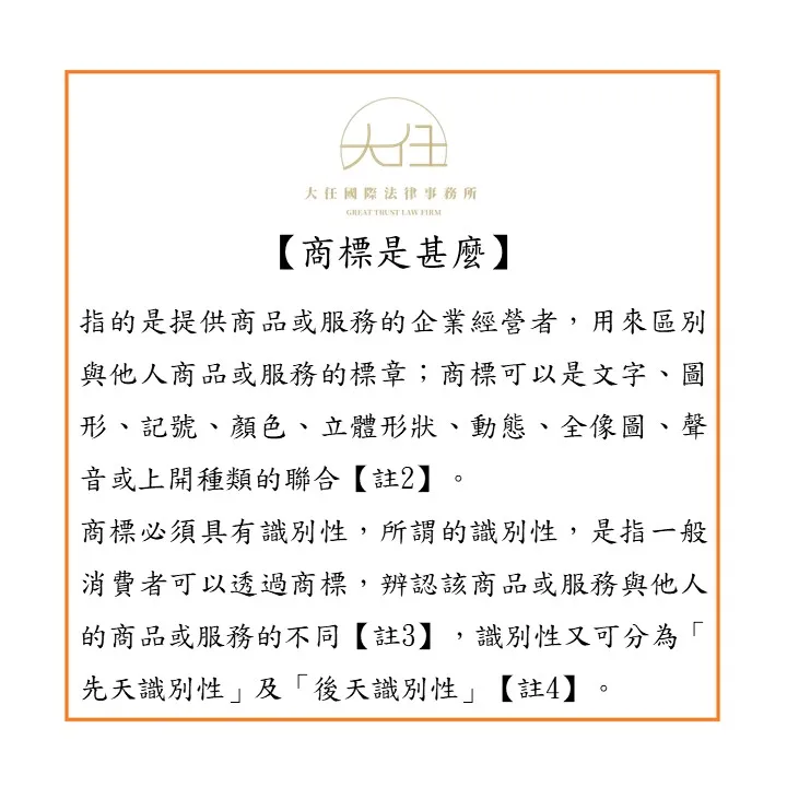 【註2】商標法第18條第1項:「商標,指任何具有識別性之標識,得以文字、圖形、記號、顏色、立體形狀、動態、全像圖、聲音等,或其聯合式所組成。」