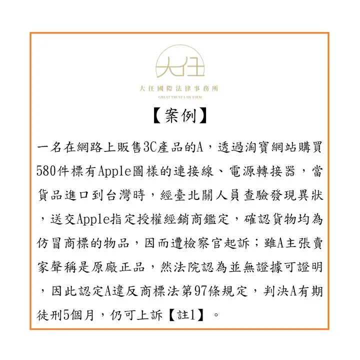 一名在網路上販售3C產品的A,透過淘寶網站購買580件標有Apple圖樣的連接線、電源轉接器,當貨品進口到台灣時,經臺北關人員查驗發現異狀,送交Apple指定授權經銷商鑑定,確認貨物均為仿冒商標的物品,因而遭檢察官起訴;雖A主張賣家聲稱是原廠正品,然法院認為並無證據可證明,因此認定A違反商標法第97條規定,判決A有期徒刑5個月,仍可上訴【註1】。