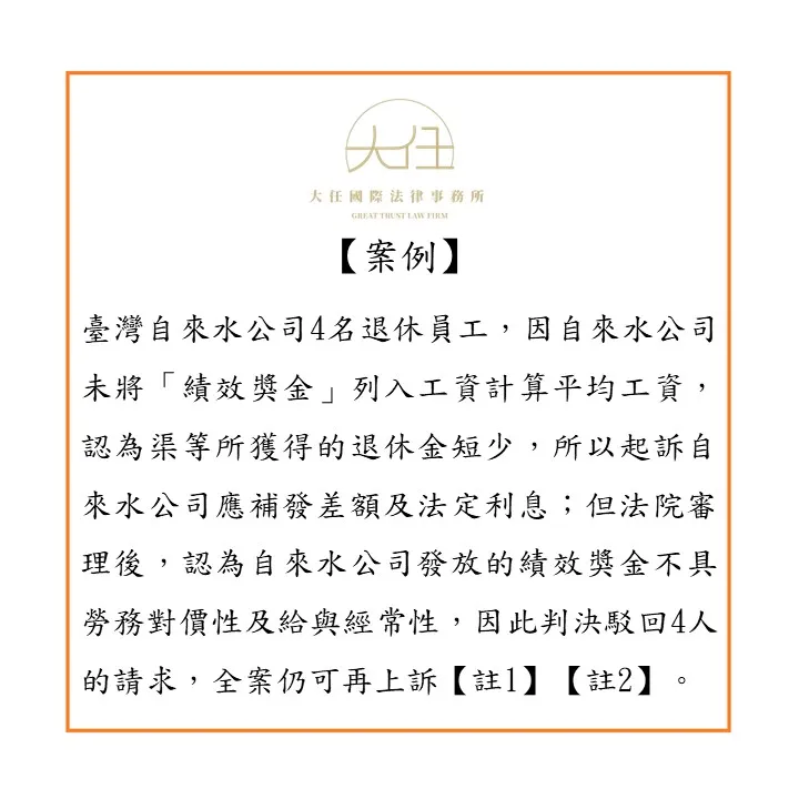 臺灣自來水公司4名退休員工,因自來水公司未將「績效獎金」列入工資計算平均工資,認為渠等所獲得的退休金短少,所以起訴自來水公司應補發差額及法定利息;但法院審理後,認為自來水公司發放的績效獎金不具勞務對價性及給與經常性,因此判決駁回4人的請求,全案仍可再上訴【註1】【註2】。