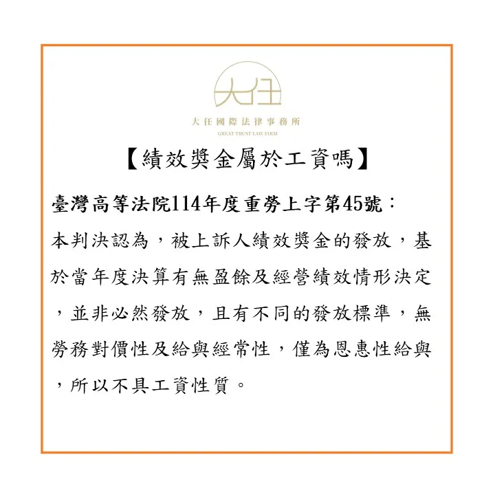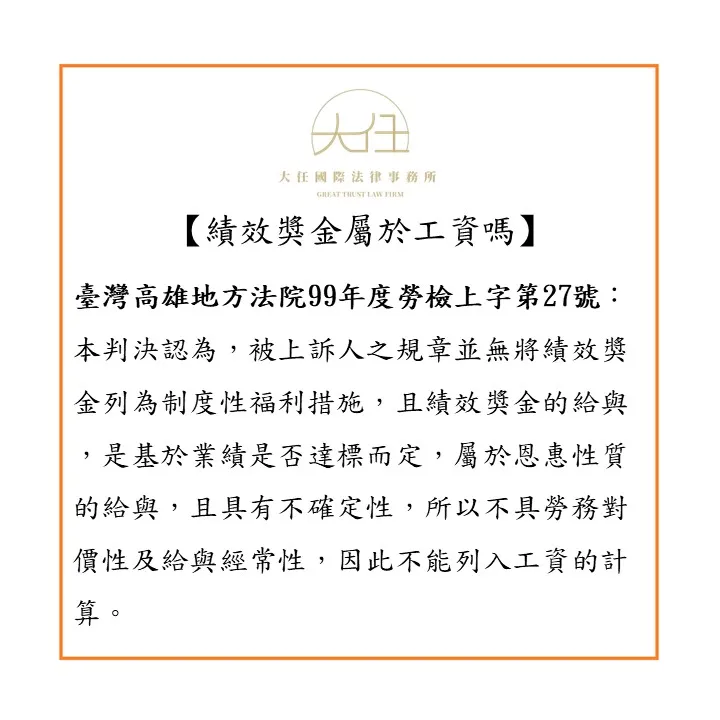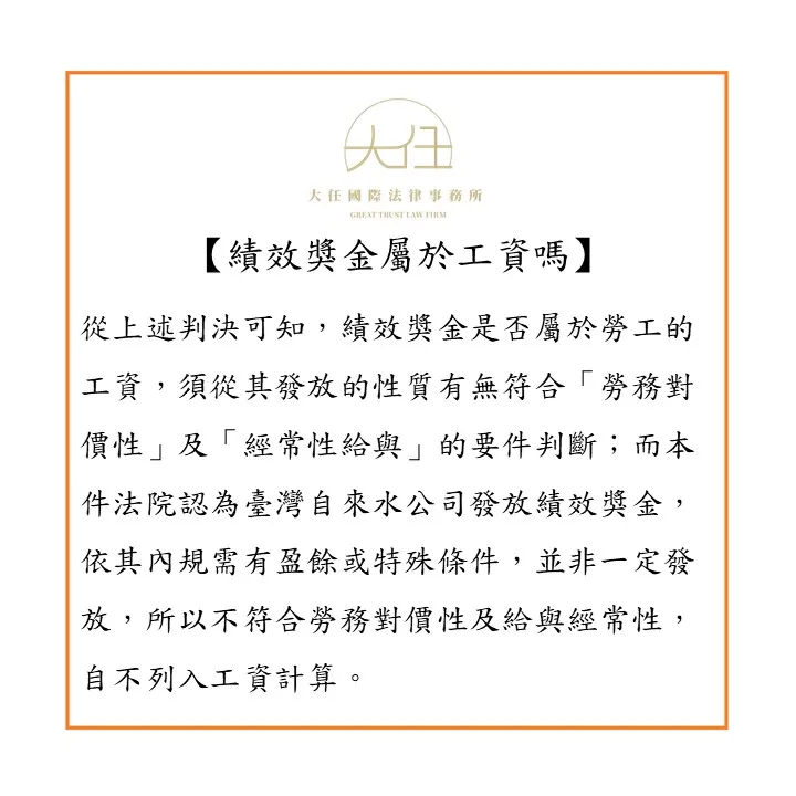 從上述判決可知,績效獎金是否屬於勞工的工資,須從其發放的性質有無符合「勞務對價性」及「經常性給與」的要件判斷;而本件法院認為臺灣自來水公司發放績效獎金,依其內規需有盈餘或特殊條件,並非一定發放,所以不符合勞務對價性及給與經常性,自不列入工資計算。