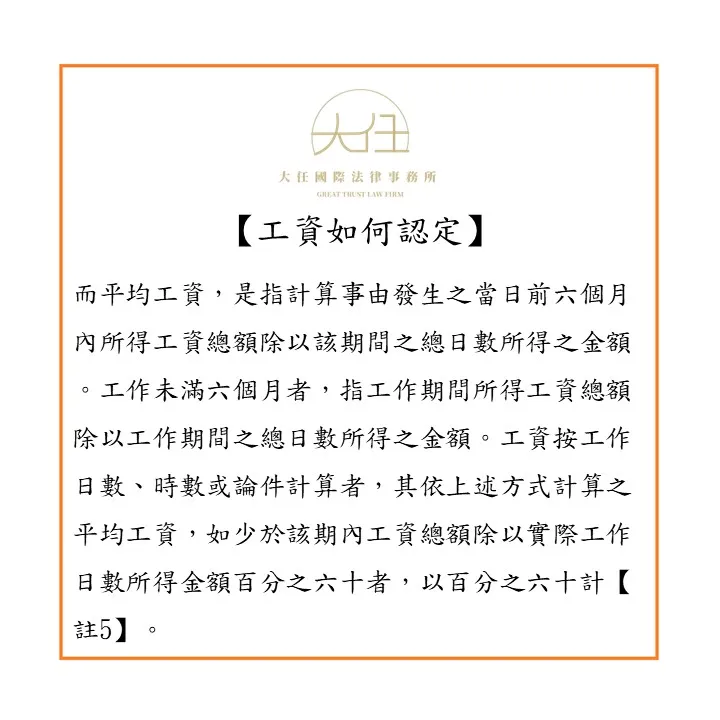而平均工資,是指計算事由發生之當日前六個月內所得工資總額除以該期間之總日數所得之金額。工作未滿六個月者,指工作期間所得工資總額除以工作期間之總日數所得之金額。工資按工作日數、時數或論件計算者,其依上述方式計算之平均工資,如少於該期內工資總額除以實際工作日數所得金額百分之六十者,以百分之六十計【註5】。