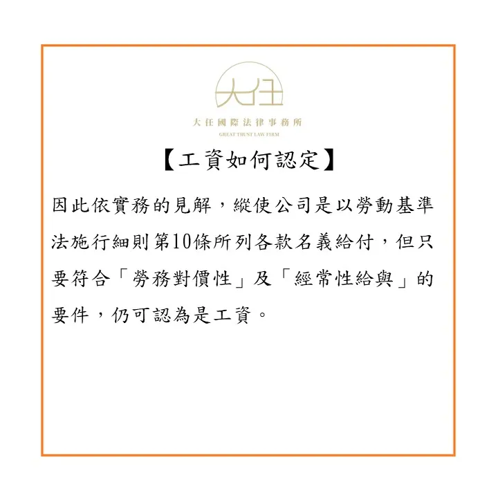 因此依實務的見解,縱使公司是以勞動基準法施行細則第10條所列各款名義給付,但只要符合「勞務對價性」及「經常性給與」的要件,仍可認為是工資。