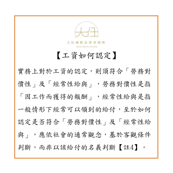 實務上對於工資的認定,則須符合「勞務對價性」及「經常性給與」,勞務對價性是指「因工作而獲得的報酬」,經常性給與是指一般情形下經常可以領到的給付,至於如何認定是否符合「勞務對價性」及「經常性給與」,應依社會的通常觀念,基於客觀條件判斷,而非以該給付的名義判斷【註4】。