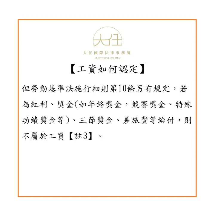 【註3】勞動基準法施行細則第10條:「本法第二條第三款所稱之其他任何名義之經常性給與係指左列各款以外之給與。一、紅利。二、獎金:指年終獎金、競賽獎金、研究發明獎金、特殊功績獎金、久任獎金、節約燃料物料獎金及其他非經常性獎金。三、春節、端午節、中秋節給與之節金。四、醫療補助費、勞工及其子女教育補助費。五、勞工直接受自顧客之服務費。六、婚喪喜慶由雇主致送之賀禮、慰問金或奠儀等。七、職業災害補償費。八、勞工保險及雇主以勞工為被保險人加入商業保險支付之保險費。九、差旅費、差旅津貼及交際費。十、工作服、作業用品及其代金。十一、其他經中央主管機關會同中央目的事業主管機關指定者。」