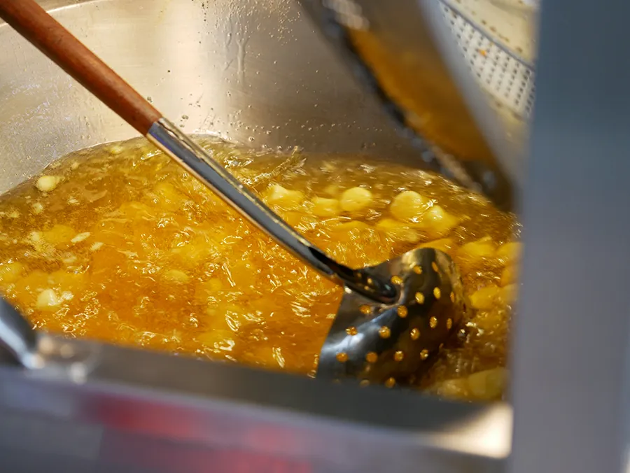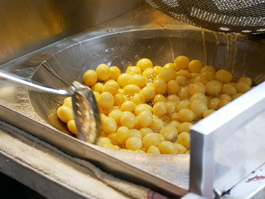 膨脹到一定程度後,看到店家使用壓勺把地瓜球壓扁後,再繼續翻攪,重複幾遍後,直到地瓜球變得很大一顆,就可以出鍋了