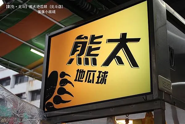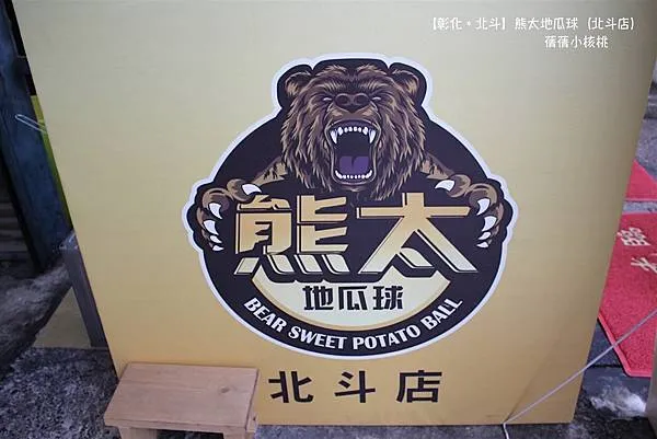 鄰近北斗名產-肉圓生、洪瑞珍三明治、田尾公路花園,就在北斗鎮奠安宮旁、85℃正對面的『熊太地瓜球 北斗店』,鮮黃色的攤子,遠看超醒目,猛瞧一眼,店家剛炸起來的地瓜球,似乎比台中的地瓜球還要巨大,金黃酥脆的巨無霸地瓜球,香氣四溢,讓人忍不住口水直流。