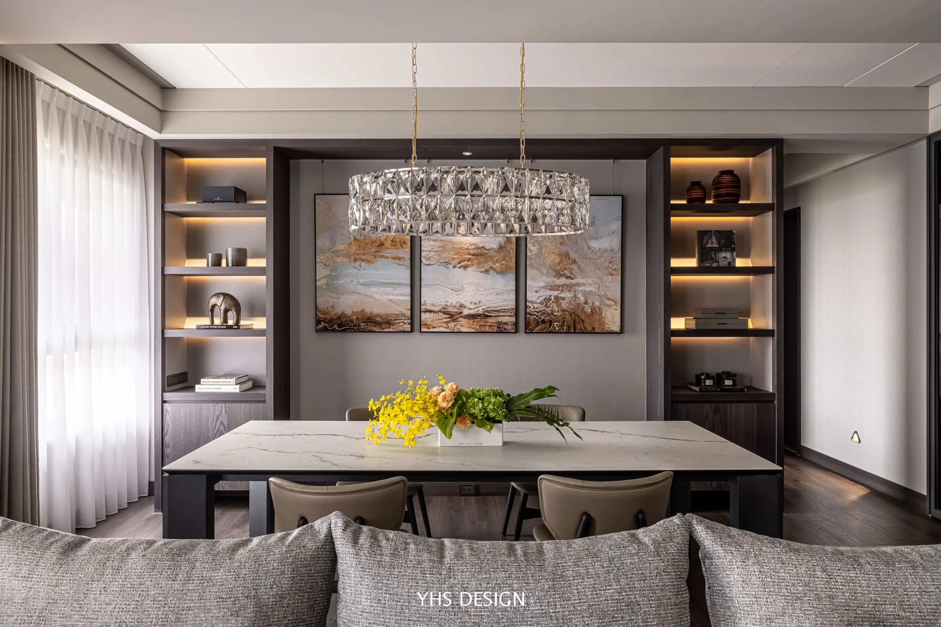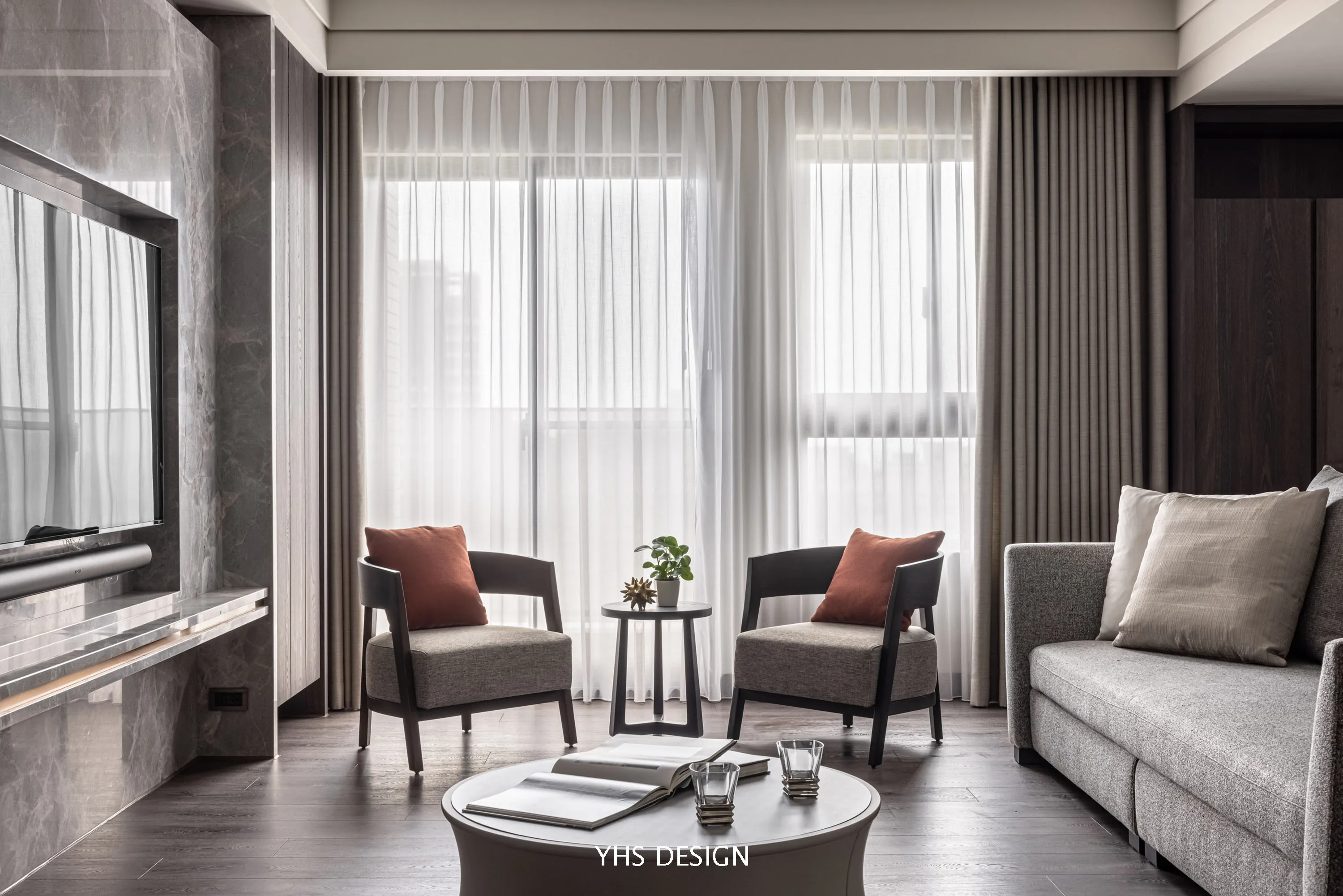 本案以優雅溫瀾的米、灰色調做為色彩基底,協搭深色框體彰顯沉穩氣度,搭配金屬線條勾勒美感,木紋、布料與大理石紋路豐富空問表情;同時保留場域大面採光與自然景致,使陽光輕輕穿透細沙布簾,將自然景茂融入空間與生活,圍塑一處令身心恬靜的居住空問,賦予了使用者靜心享受細緻生活的設計形式。