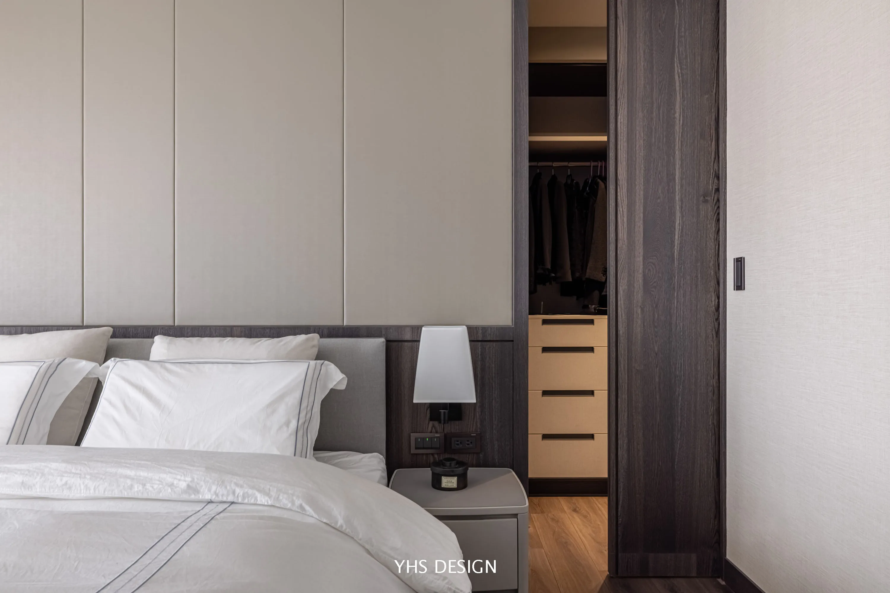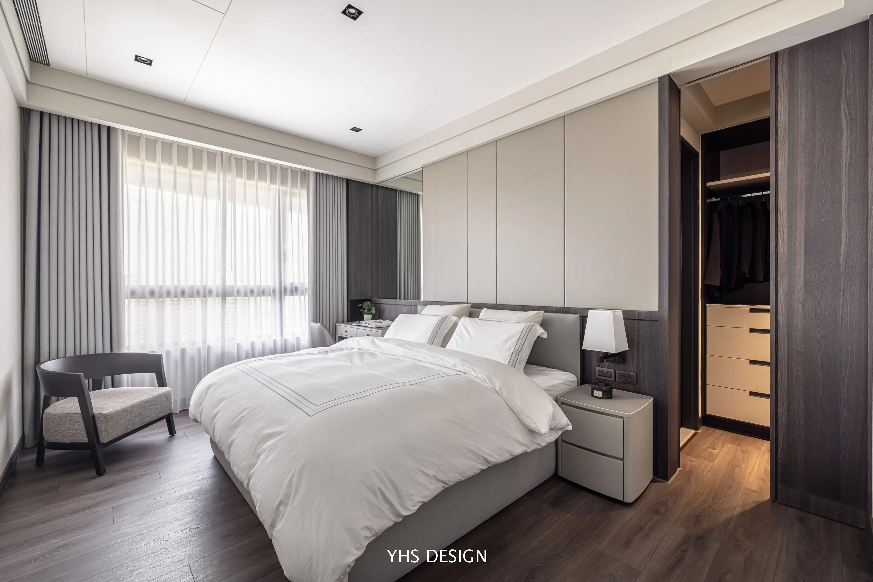 臥室部分則延伸公區的米、灰色調,配以深色木皮,打造柔和優美的質感。將軟件和木作平均分配,於化妝桌左側為女主人配置隱藏式收納櫃,由空間締造起簡約的生活方式,讓居住者能感受到大氣氛圍,獲得高度舒適的居住體驗。
