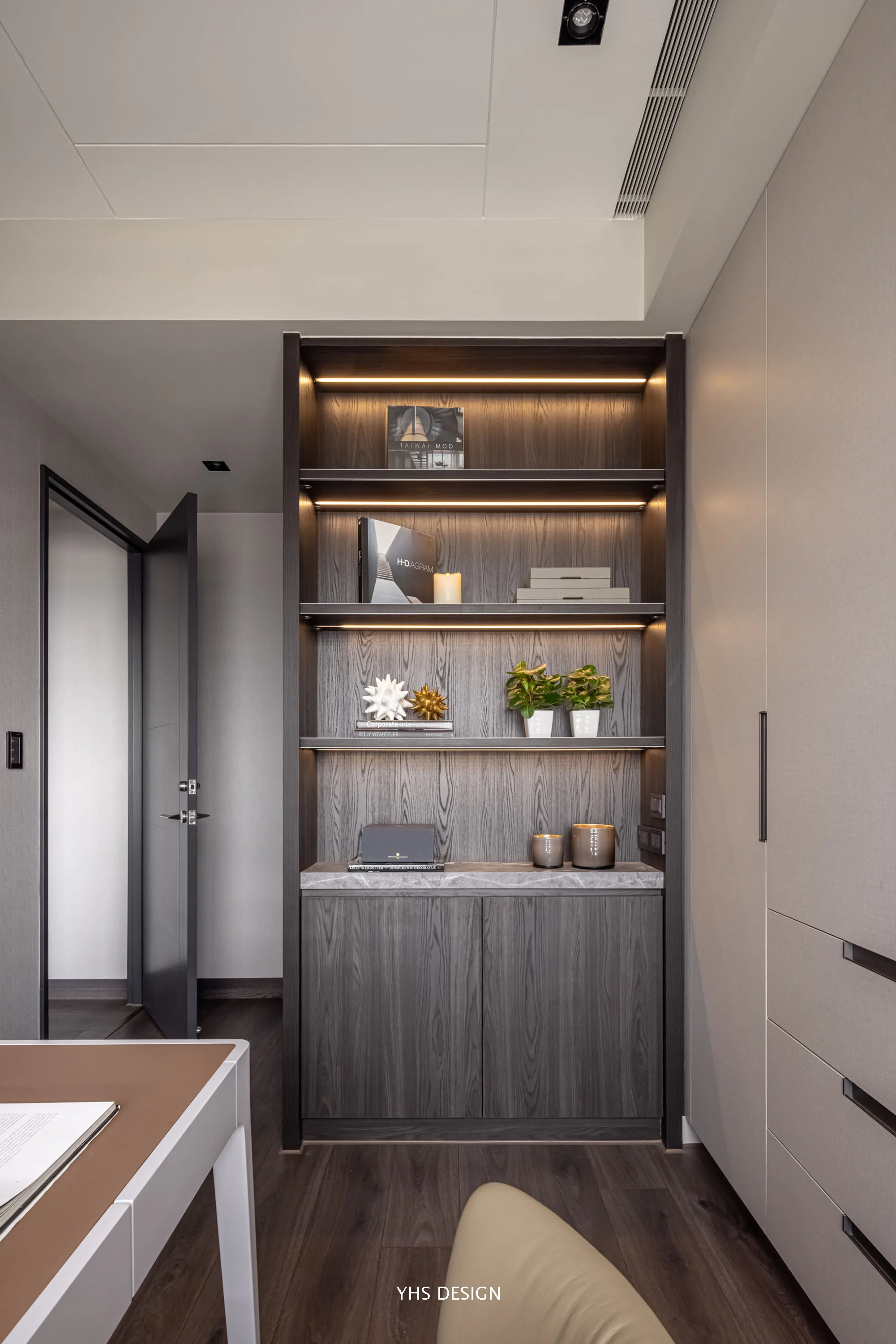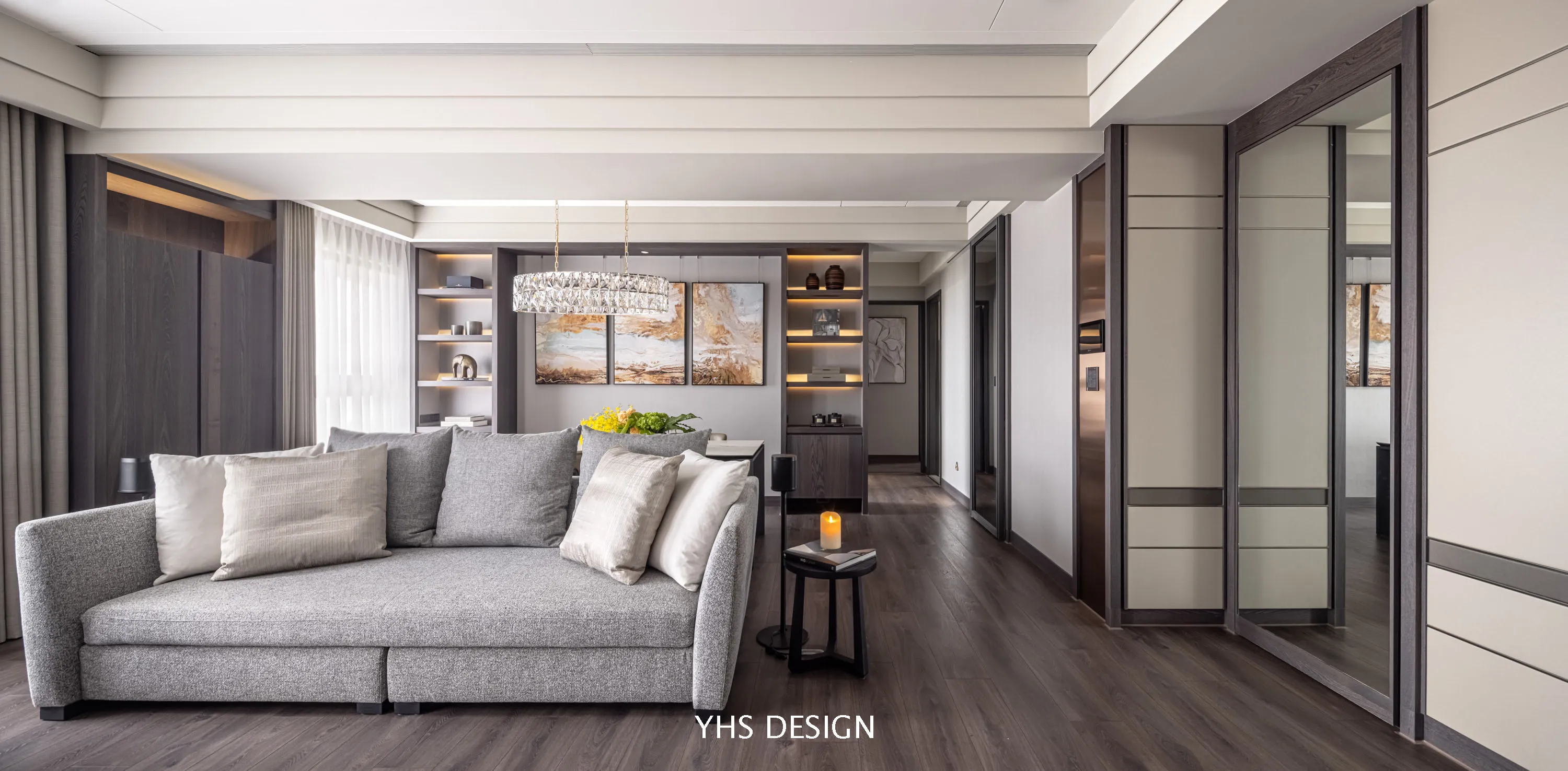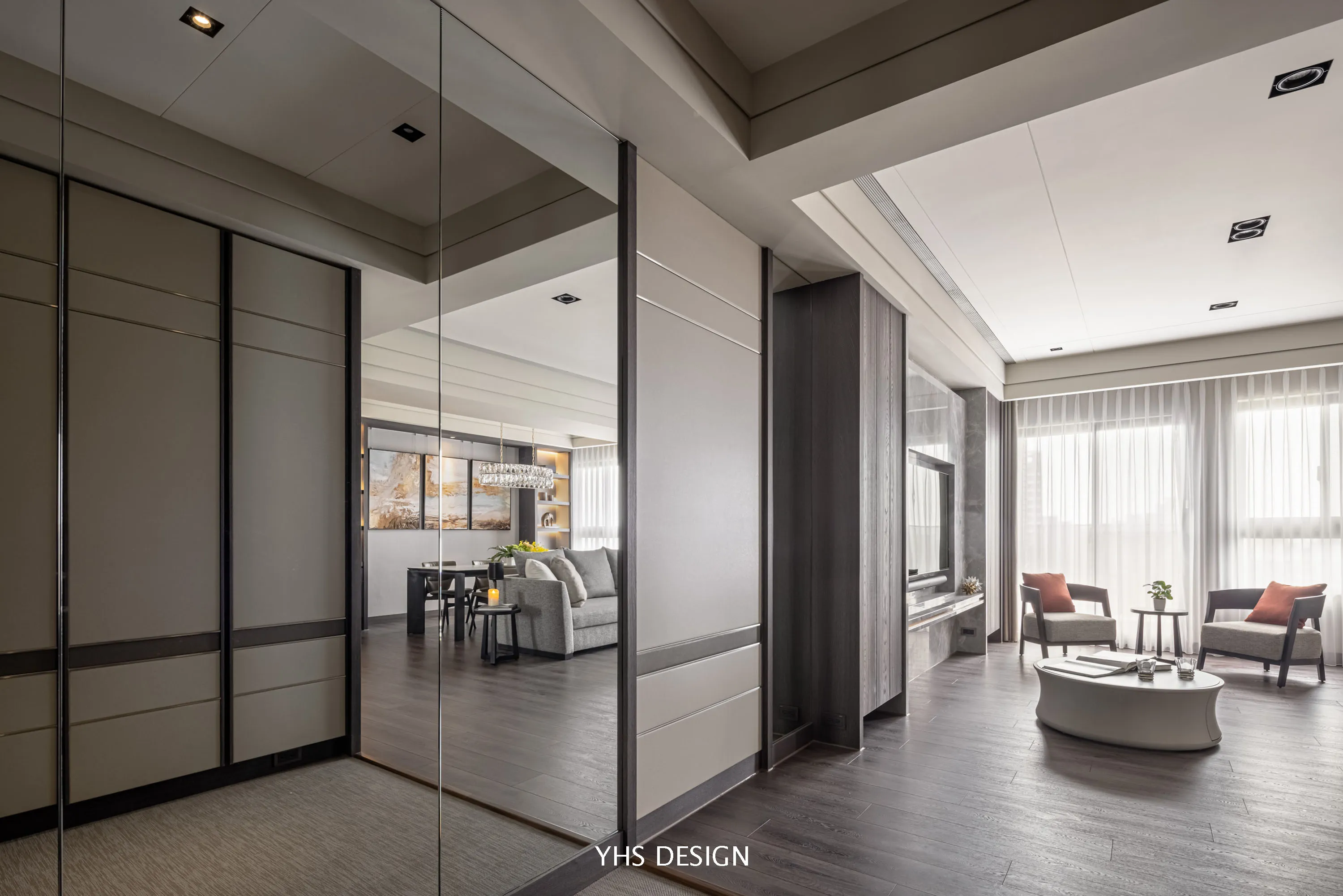 另外,特別於公區側邊設立獨立儲藏空間,以鏡面修飾、融合整體調性,為居住者締造大量且隱密的收納區配圍。