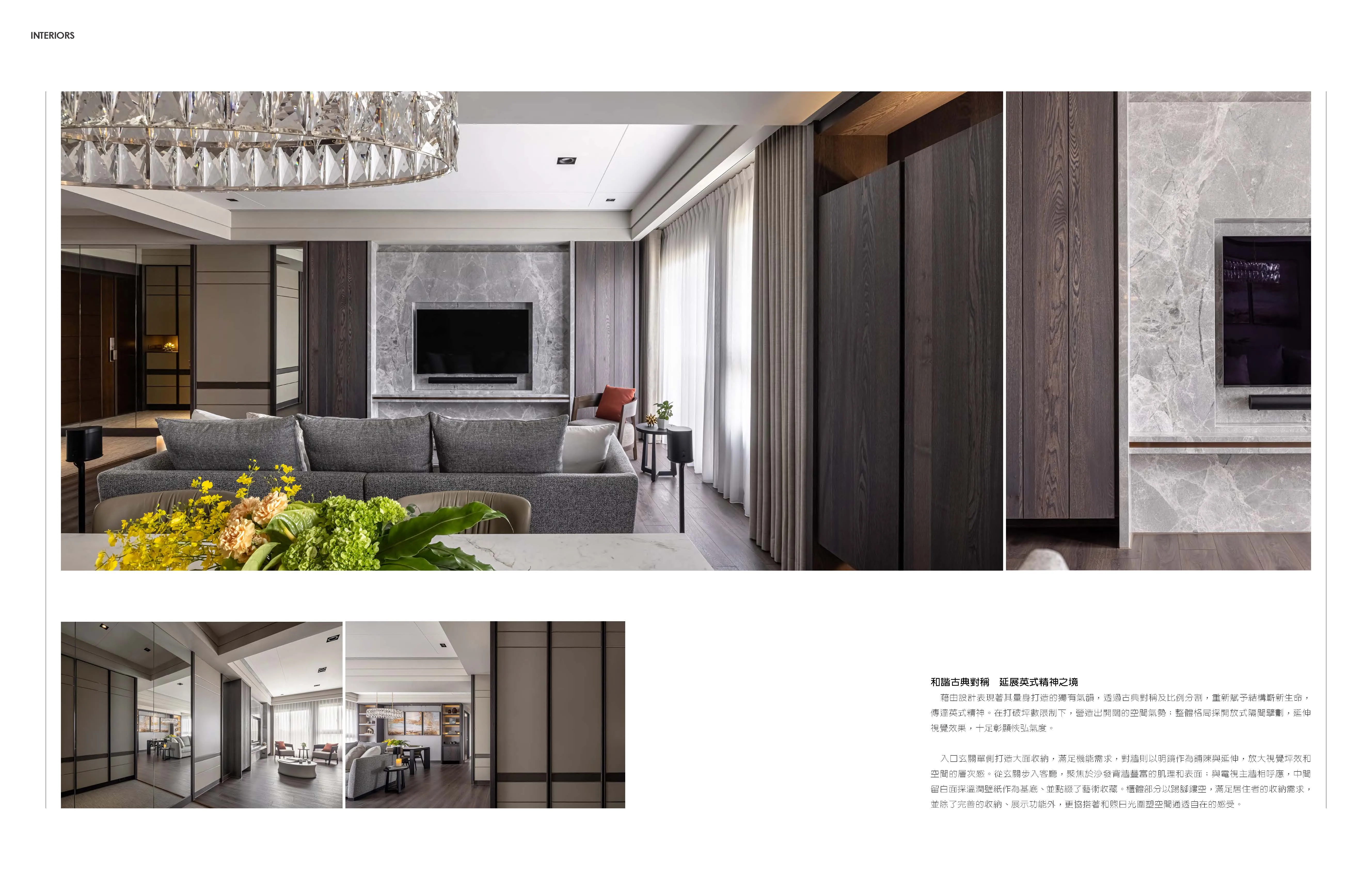 藉由設計表現著其量身打造的獨有氣韻,透過古典對稱及比例分割,重新賦予結構斬新生命,傳達英式精神。在打破坪數限制下,營造出開闊的空間氣勢;整體格局採開放式隔間壁劃,延伸視覺效果,十足彰顯俠弘氣度。