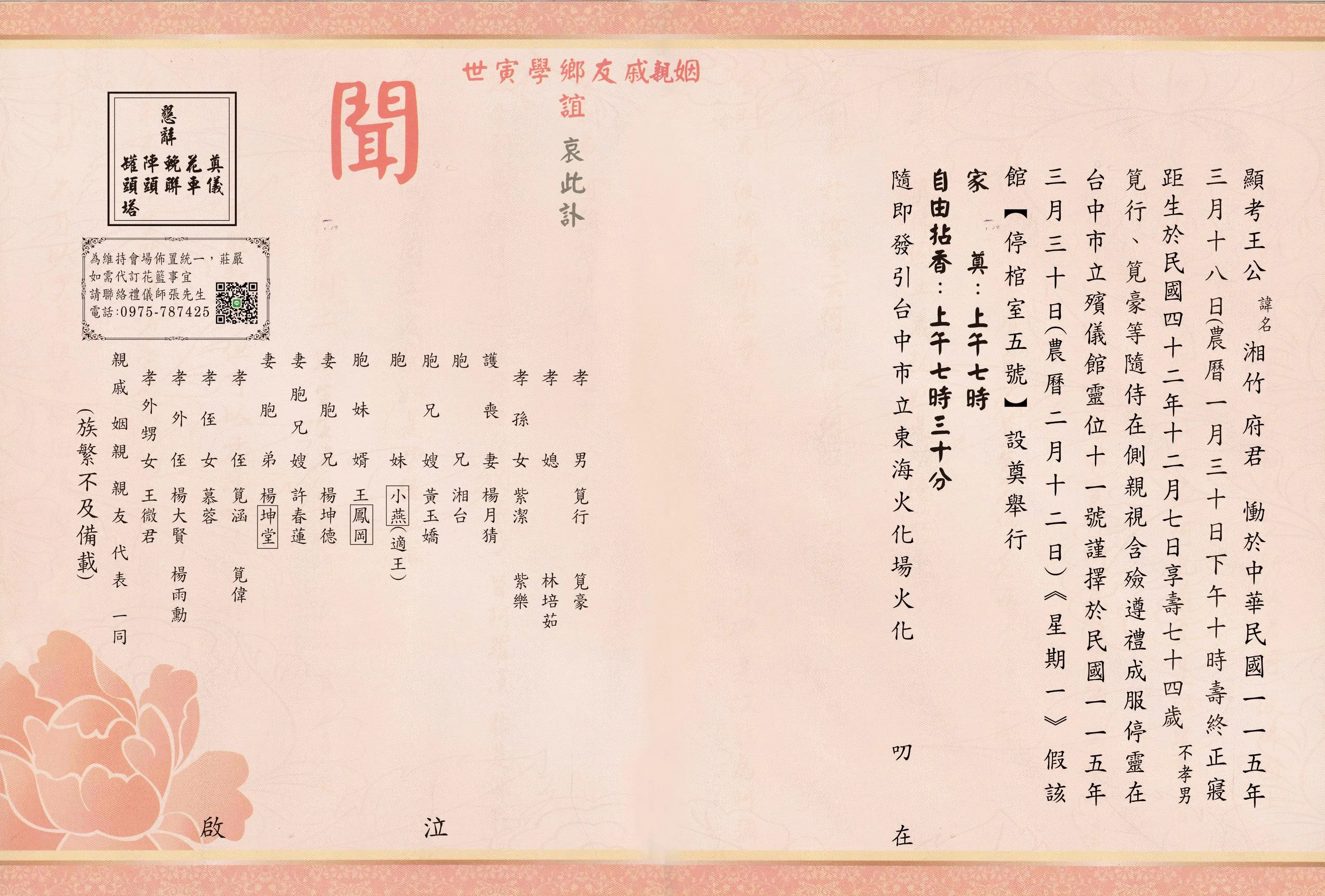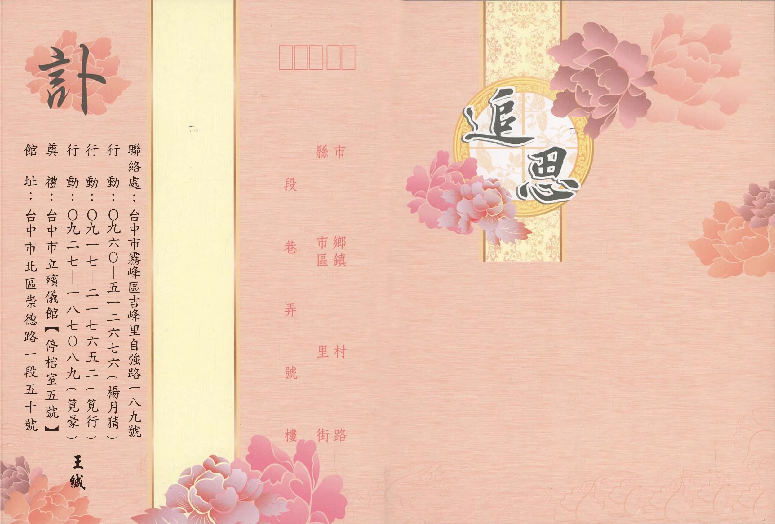 追思會場:臺中市北區崇德路一段50號【停棺室五號】