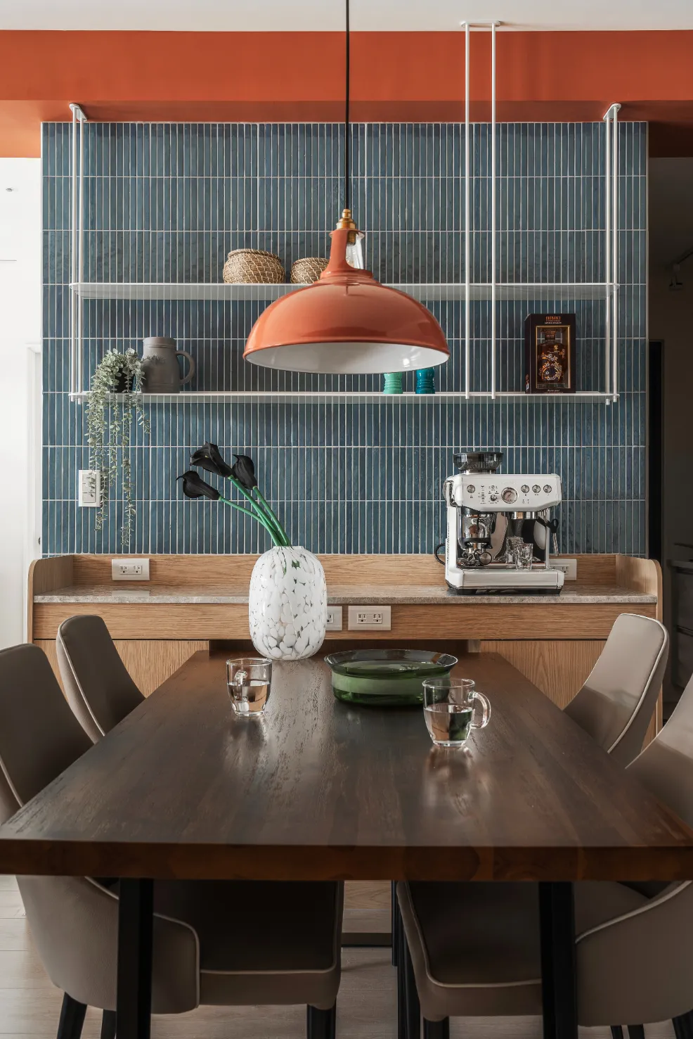 整體配色以米白與淺木質作為空間基底,讓視覺乾淨、耐看;再用磚橙色落在樑體與局部細節,成為空間的記憶點;最後透過燈具與軟裝做少量點綴。