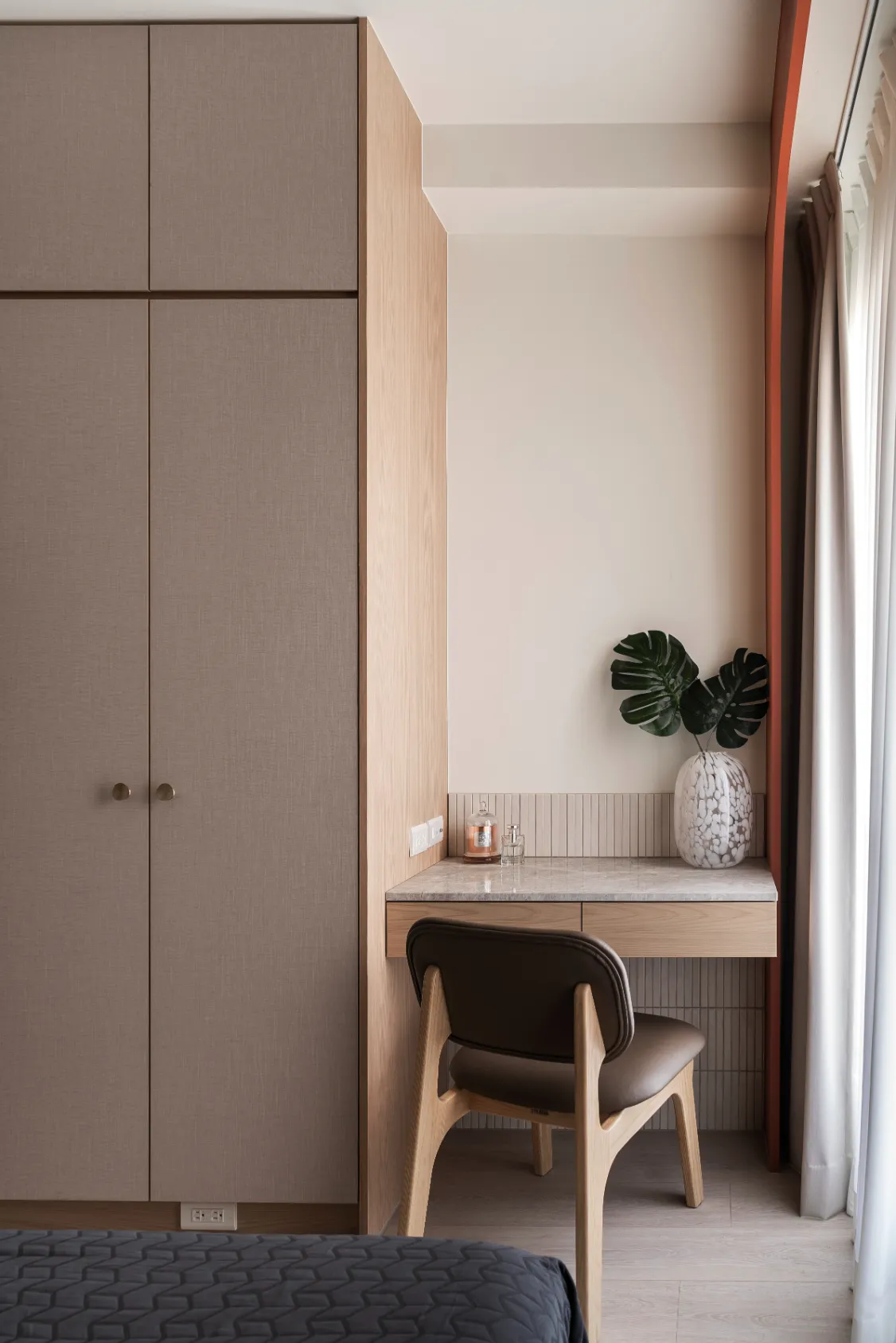 材質的選擇則介於質感與實用之間。公共空間以木皮與系統板材為主,維持溫潤的視覺,同時兼顧日常耐用;餐廚牆面使用長條磁磚,除了讓畫面更有節奏,也方便清潔油煙;臥室透過石材點綴梳妝區,讓私領域多一點沉穩感。不同材質交錯使用,讓空間在簡約中仍保有細節。