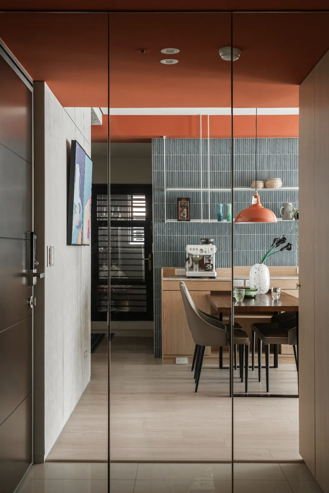 在機能配置上,25 坪依然能做到完整收納與順暢動線。櫃體多採頂天立地設計,減少視覺切割,也提升收納效率;玄關以無銅鏡玻璃引入光線,不只放大空間感,也讓進門的第一眼更清爽。