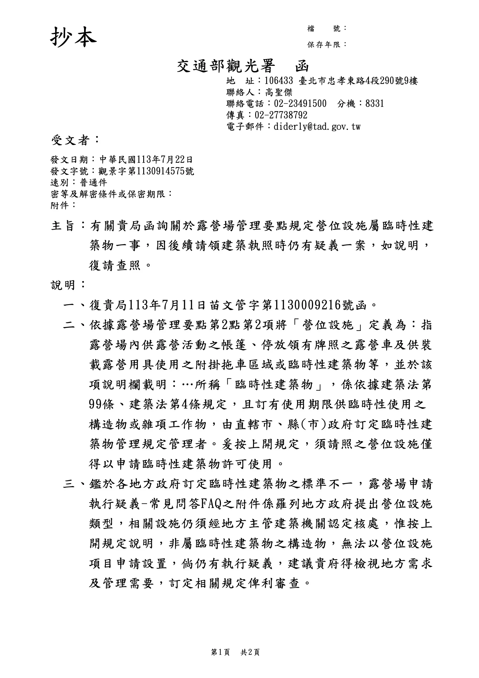 有關露營場管理要點規定營位設施屬臨時性建築物一事